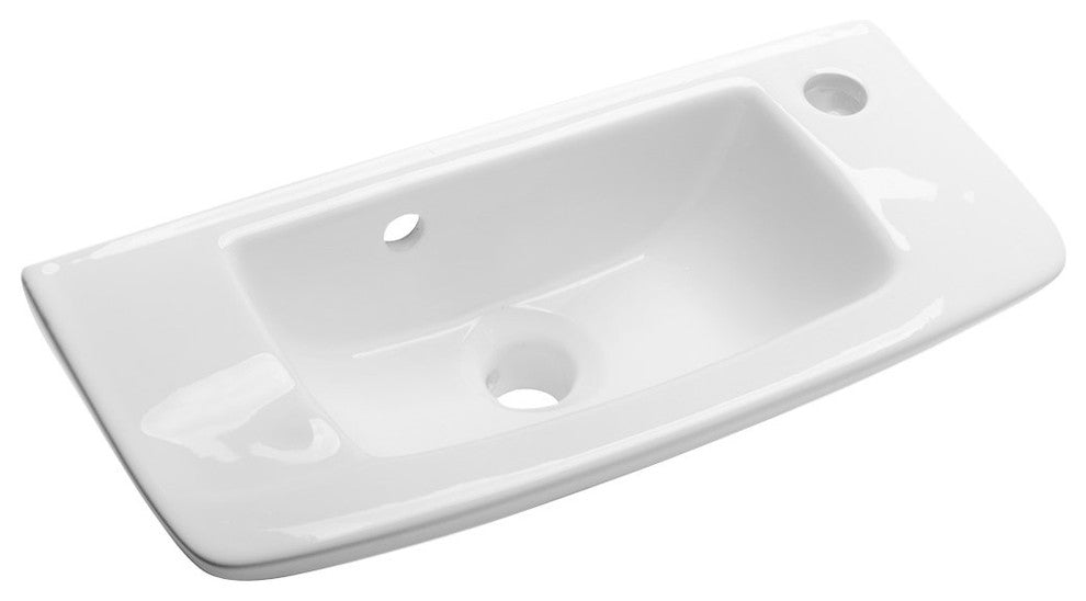 Item 94229 Small Wall Mount Bathroom Sink from Renovator''s Supply features durable Porcelain Ceramic Construction with Porcelain Gloss Finish and Left Side Faucet Hole. Easy to Clean, Scratch and Stain Resistant. Easy Lag Bolt Installation Cute Elegant Little Sink for a great space saving design. Faucet and drain sold separately. Mounting bracket not required, installs with lag bolts only.