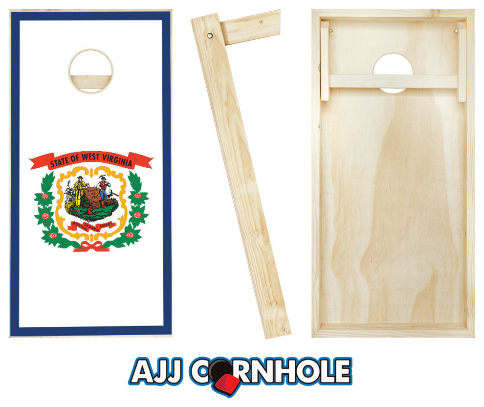 This top of the line West Virginia Flag Cornhole Set is sure to bring life to any party! Set comes ready to play with 4 red and 4 royal blue cornhole bags. All sets are made using a premium 2x4 frame and 1/2" sanded plywood playing surface. Each set has folding 2x4 legs secured with galvanized bolts.