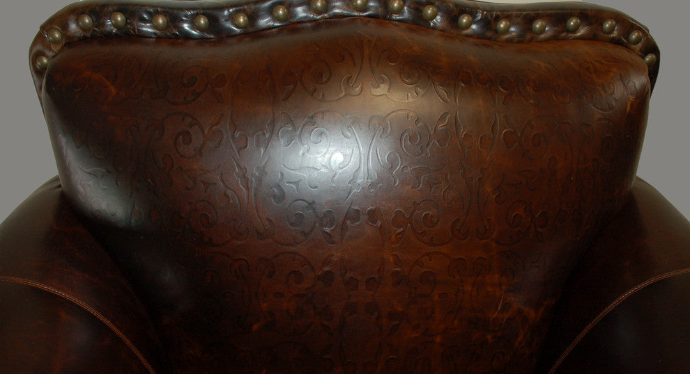 Great Blue Heron''s Western Royalty Club Chair features our popular embossed "Regal" accenting arm panels, and seat rail, and in the center of the window frame seat cushion. On both sides of the "V" insert is Brazilian cowhide with the white portion of the hide used to accent the "V". The rest of the chair is covered with our popular distressed "Buffalo" top grain leather. Constructed using no sag hand tied springs, kiln dried Oak frame components and high density foam Great Blue Heron''s chairs are built to last and be enjoyed and used for years.
