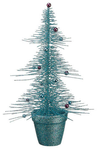 Turquoise Glittered Spike Table TreeItem #XAT532-TQThis sharp looking table tree is drenched in turquoise glitterDimensions: 16" high x 9" diameterMaterial(s): Pastic/Wire