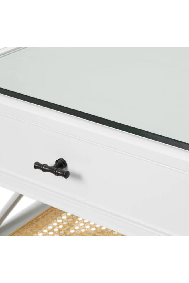 Radiate elegance with the Side Table Bahamas, featuring a sleek piano white finish that envelops its refined silhouette. Complemented by natural cane accents and a pristine glass top, this piece seamlessly blends airy sophistication with modern allure, perfect for discerning tastes seeking understated luxury. Transform your space with its timeless beauty and exquisite design elements.