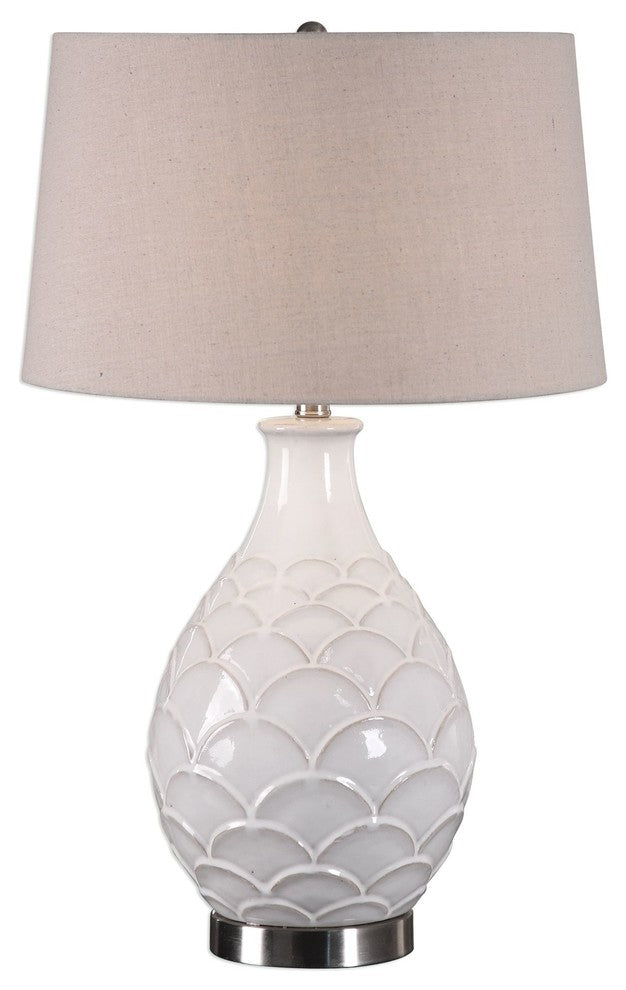 Budding ceramic design, finished in a lightly distressed glossed white glaze, accented with brushed nickel plated details. The tapered round hardback shade is a light oatmeal linen fabric with natural slubbing. Due to the nature of fired glazes on ceramic lamps, finishes will vary slightly.