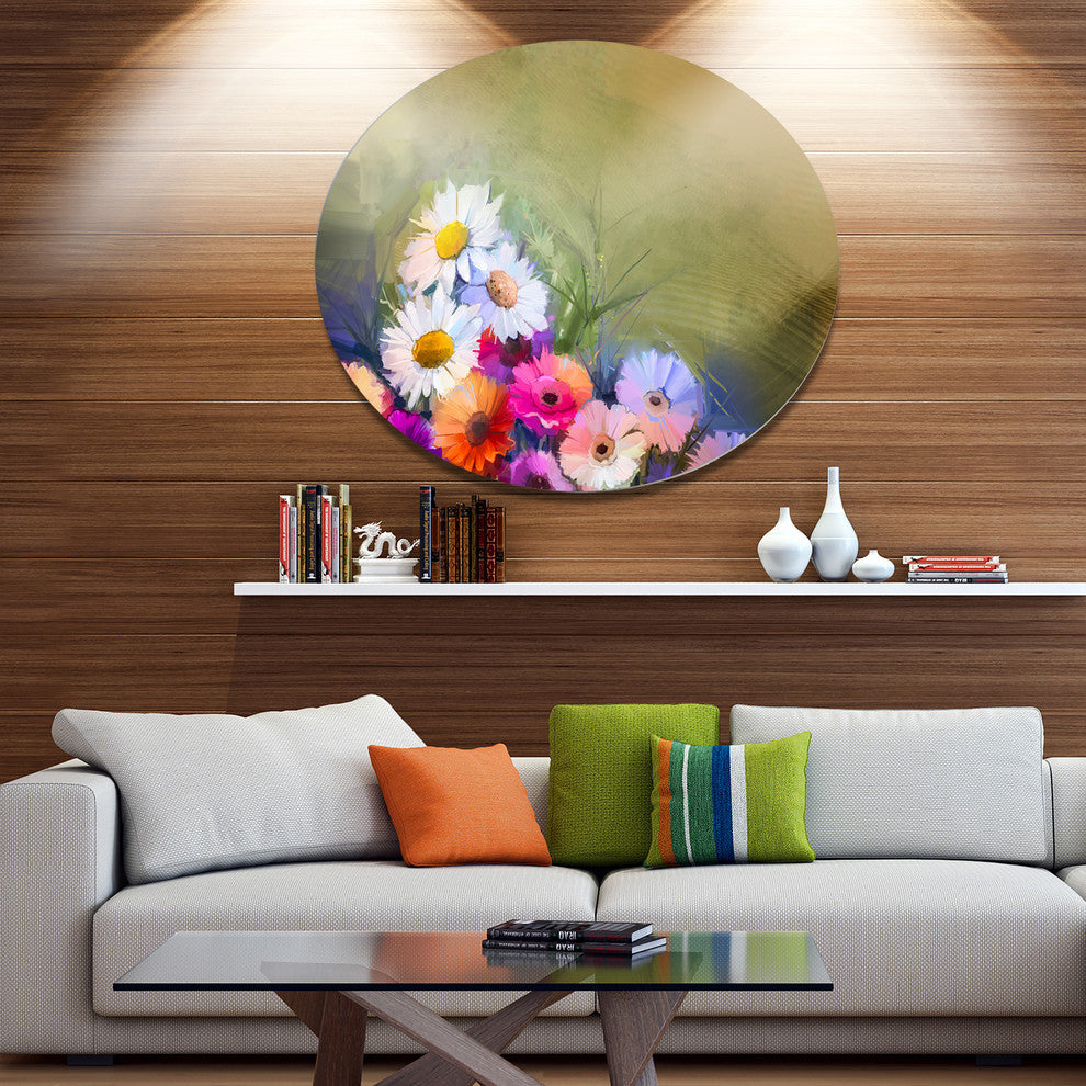 Bring Contemporary Abstraction to your home with this large Circle Metal wall art. This White Sunflower and Gerbera Flowers Metal Artwork makes it the focal point of any room or office.