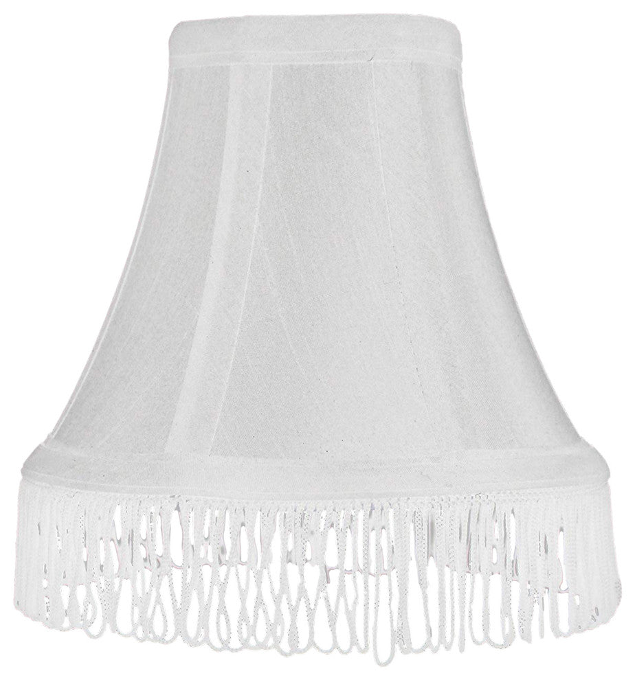 Urbanest silk bell chandelier shade in white with white fringe.This shade measures 3" across the top, 6" across the bottom, and 5" overall height. The fringe measures 1 1/4" long and hangs from the bottom of the shade.Softback silk bell shape. Clip-on for candleabra bulbs. Maximum recommended wattage is 40 watts.Lined with white fabric.List price is for 1 shade.