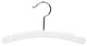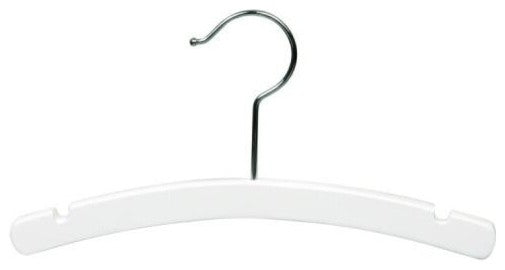 These white 12" arched wood children''s hangers feature a space-saving flat body, two notches for the option of hanging straps and a polished chrome swivel hook. Finished with a double coating of white lacquer to prevent splintering. These hangers are the ideal size for children''s clothing and are best suited for kids approximately 4 to 10 years of age. Sold in packs of 25 hangers.