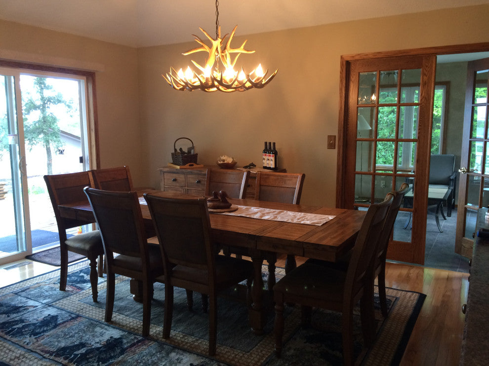 Real Antler Whitetail Oblong Chandelier (38-40"L x 28-29"W x 17"H), 8 Light Sockets, 6 feet of rustic bronze chain. With Rawhide Shades.Handmade in North America using top quality naturally shed real antlers. Sockets are made to resemble real antler, each socket rated up to 60 Watts. Comes balanced and ready to hang. Frosted Bent Tip Candelabra Bulbs included. Certified in U.S & Canada (CSA listed to comply with UL 1598)