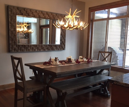 Real Antler Whitetail Oblong Chandelier (34"L x 26"W x 17"H), 8 Light Sockets, 6 feet of rustic bronze chain. With Rawhide Shades.Handmade in North America using top quality naturally shed real antlers. Sockets are made to resemble real antler, each socket rated up to 60 Watts. Comes balanced and ready to hang. Frosted Bent Tip Candelabra Bulbs included. Certified in U.S & Canada (CSA listed to comply with UL 1598)