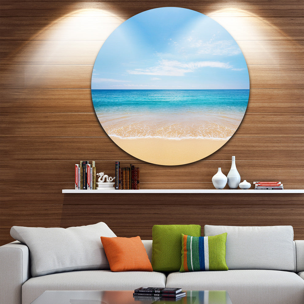 Bring Contemporary Abstraction to your home with this large Circle Metal wall art. This Wide Blue Sky Over Beach Metal Artwork makes it the focal point of any room or office.