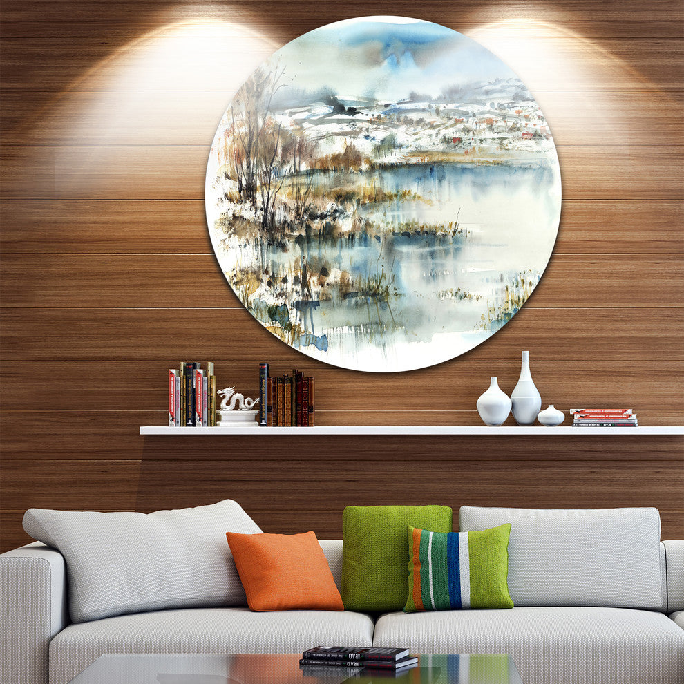 Bring Contemporary Abstraction to your home with this large Circle Metal wall art. This Wide Blue Winter Lake Watercolor Metal Artwork makes it the focal point of any room or office.