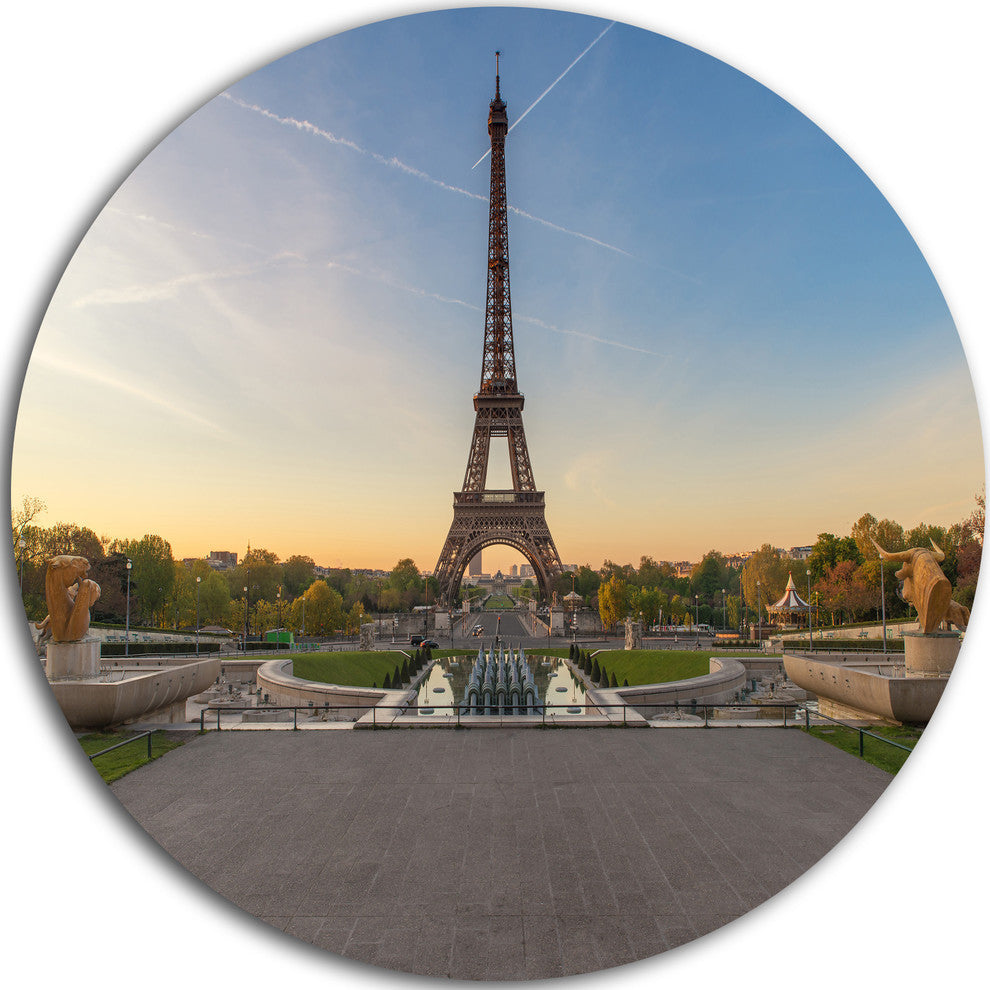 Wide View Of Paris Eiffel Tower At Sunrise, Round Metal Wall Art, 36"