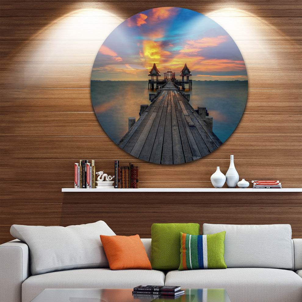 Wide Wooden Bridge Into Distant Sun, Sea Pier Disc Metal Artwork, 36"