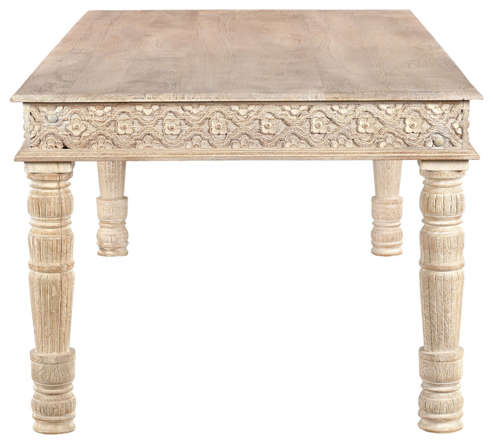 Echoing the charm of yesteryears, this rectangular dining table anchors your dining room with its vintage-inspired design. Crafted from solid mango wood, it features a neutral finish with distressed accents, adding a touch of weathered appeal to your decor. Traditional turned legs bring classic elegance, while botanical carvings along the apron impart a bohemian flair. Assembly is necessary to complete the ensemble and create a welcoming space for entertaining.