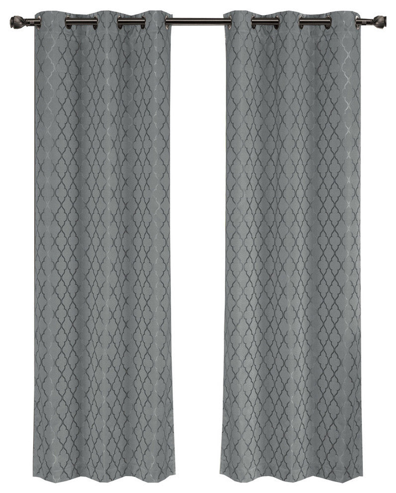 The stylish geometric pattern of these floor-length curtains conveys a refined and classic look to your home. Containing a pole pocket design, these jacquard curtains are well-suited with traditional curtain rods, allowing you to change your room easily. This trendy and functional curtain panel pair is thermal-insulated, blocks out the glaring sunlight during the hot summer months, and keeps cold drafts adrift. Block unwanted light and protect your room against outside temperatures with these thermal blackout curtains. These energy saving curtains are both beautiful and practical. The curtains are machine washable for easy care. - Sold in pairs- 100% polyester- Royal Tradition Brand- Thermal-insulated backing- Innovated fabric construction- Blocks over 99% of light than ordinary curtains- Triple-pass thermal coating back layer- Provides noise reduction and privacy- Saves on home heating and cooling costs- Silver Grommets- Machine-washable Available Sizes Include:- 84"W x 63"L Pair. (42"W x 63"L each) - 84"W x 84"L Pair. (42"W x 84"L each) - 84"W x 96"L Pair. (42"W x 96"L each) - 84"W x 108"L Pair. (42"W x 108"L each)