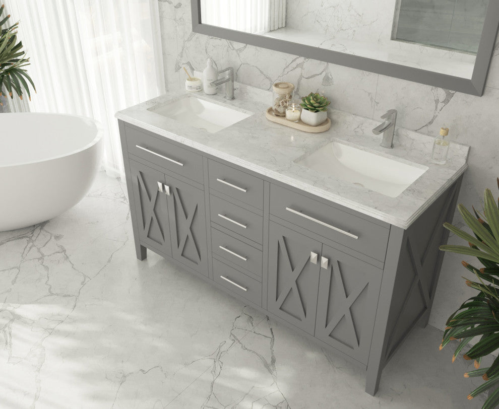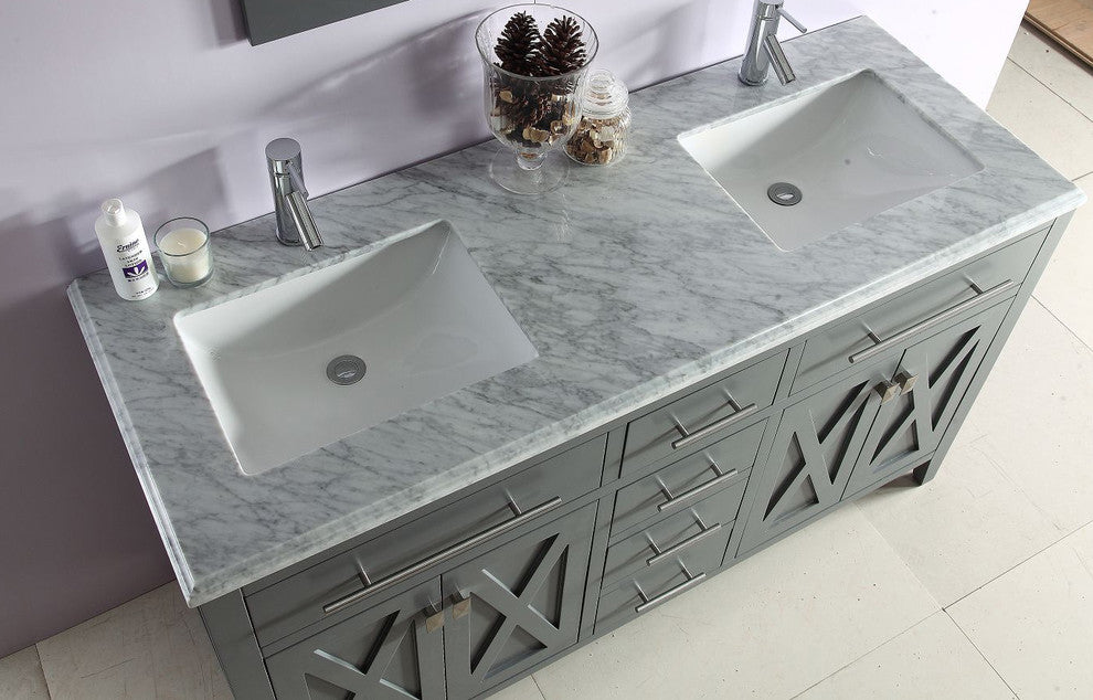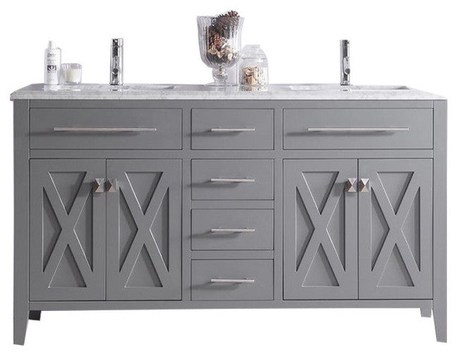 With its barn-style door fronts and clean-lined design, the Wimbledon vanity adds simple charm to your bathroom. It pairs seamlessly with farmhouse, transitional and beach-style spaces.Does not include faucets, mirror, plumbing or any decorative items picturedIncludes countertop, undermount sinks and cabinet hardware4 cabinet doors with interior shelves4 drawersPlease note: Marble countertops are natural stone and may have variations in color and veinsFinish: GrayMaterials: Solid wood, plywoodDimensions: W 60" x D 22" x H 34.6"