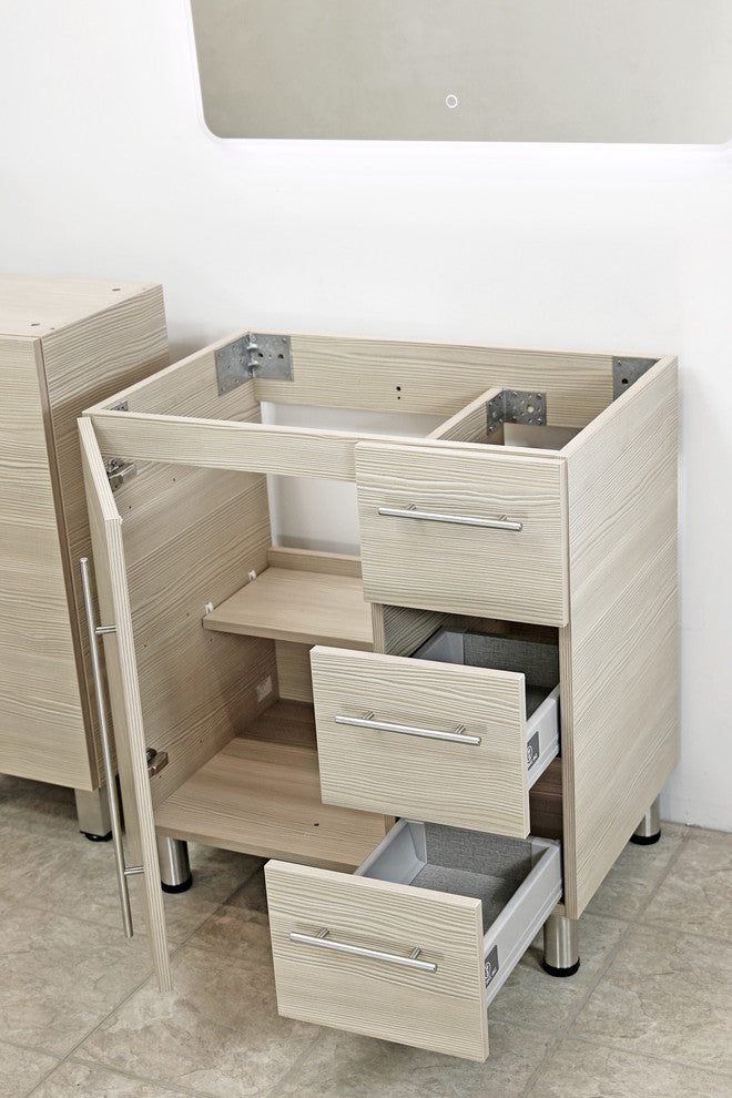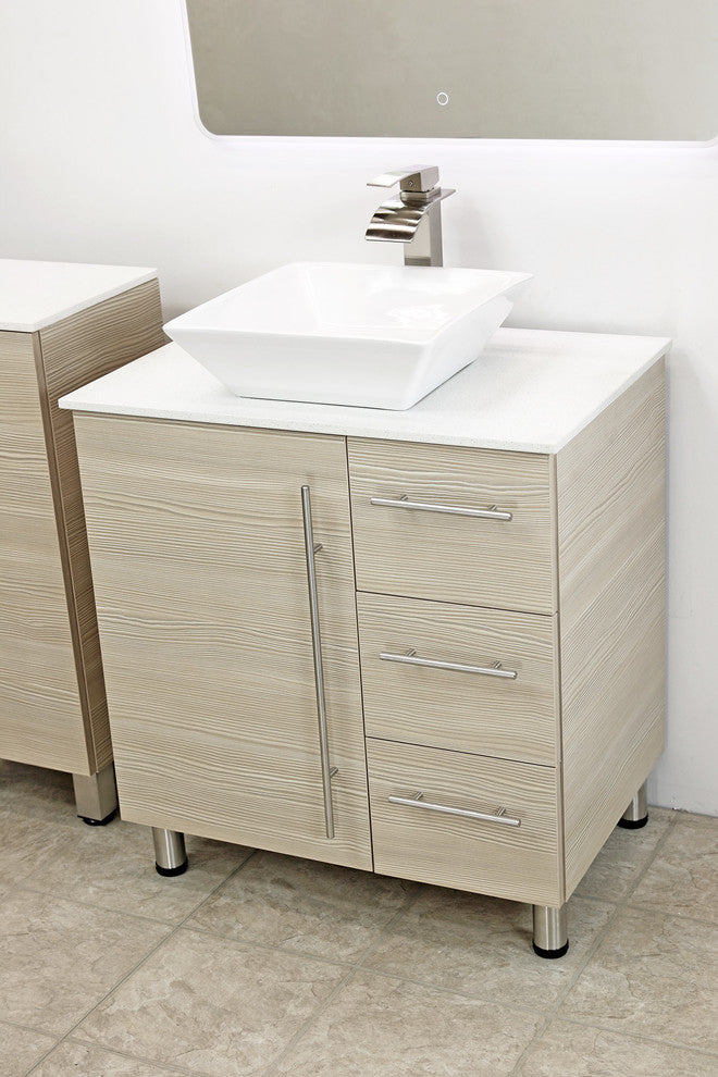Vanity cabinet:•  Brand: WindBay •  Cabinet width : 29"•  Cabinet depth: 20"•  Cabinet height without countertop: 31-3/4"•  Heavy duty soft-closing drawer gliders. •  Durable finish and easy to maintain.•  Upgraded brackets. Construction hurricane grade brackets.•  Heavy Duty hydraulic soft-closing hinges.•  Cabinet fully assembled. Customer must install the legs and handles.•  Completely finished panels, including edges.•  Stainless steel adjustable legs.White stone countertop:The countertop is made from white stone. Polished in a high durable stain and scratch resistant finish. One faucet hole and one drain hole are prefabricated. •  Width: 30" •  Depth: 20-1/2" •  Faucet hole: 1-3/8"(35mm) diameter •  Drain hole: 1-3/4"(45mm) diameterWhite ceramic vessel sink: •  Width: 16" •  Depth: 16" •  Height: 5"Includes: Sink, countertop, vanity cabinet, handles, and legs. The faucet and drain are not included.Attention:Due to screen differences, the actual color may vary slightly from what appears on your monitor or phone. Contact us for a color sample if you need help selecting a finish.