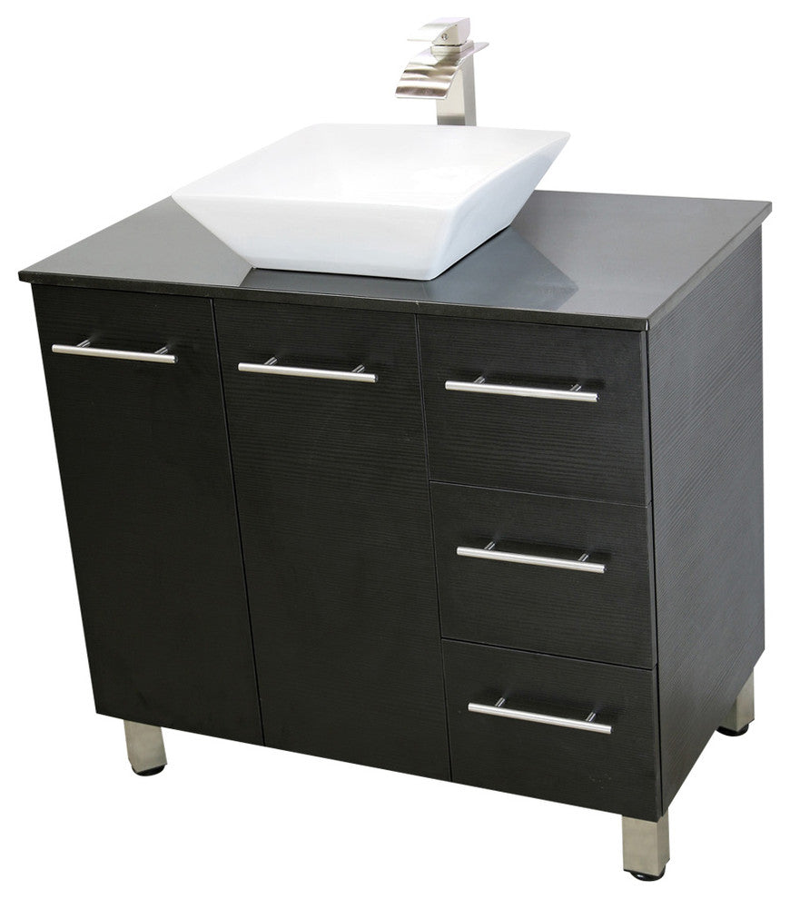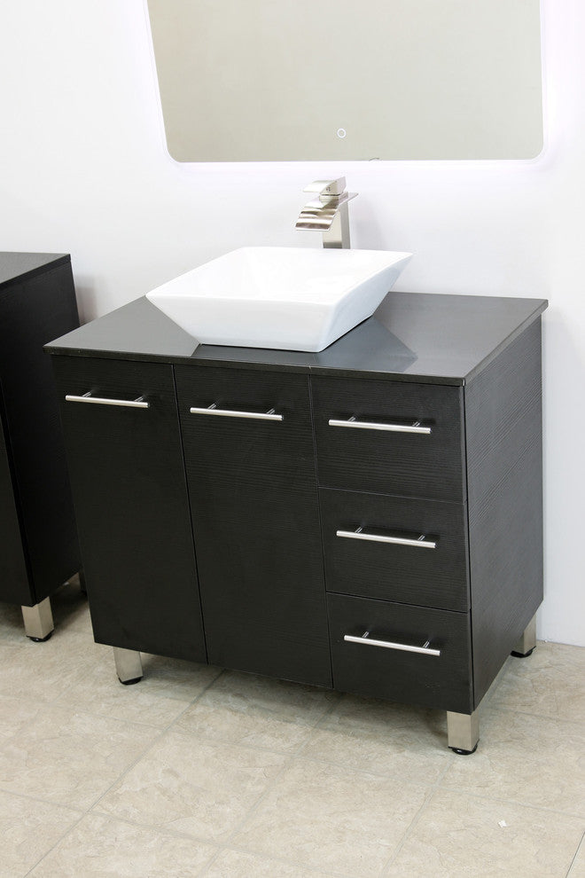 Vanity cabinet:•  Brand: WindBay •  Cabinet width : 47"•  Cabinet depth: 20"•  Cabinet height without countertop: 31-3/4"•  3 Heavy duty soft-closing drawer gliders. •  Durable finish and easy to maintain.•  Upgraded brackets. Construction hurricane grade brackets.•  Heavy Duty hydraulic soft-closing hinges.•  Cabinet fully assembled. Customer must install the legs and handles.•  Completely finished panels, including edges.•  Stainless steel adjustable legs.Black stone countertop: The countertop is made from black stone. Polished in a high durable stain and scratch resistant finish. One faucet hole and one drain hole are prefabricated. •  Width: 48"•  Depth: 20-1/2"•  Faucet hole: 1-3/8"(35mm) diameter•  Drain hole: 1-3/4"(45mm) diameterWhite ceramic vessel sink: •  Width: 16" •  Depth: 16" •  Height: 5"Includes: Sink, countertop, vanity cabinet, handles, and legs. Faucet and drain not included.Attention:Due to screen differences, the actual color may vary slightly from what appears on your monitor or phone. Contact us for a color sample if you need help selecting a finish.