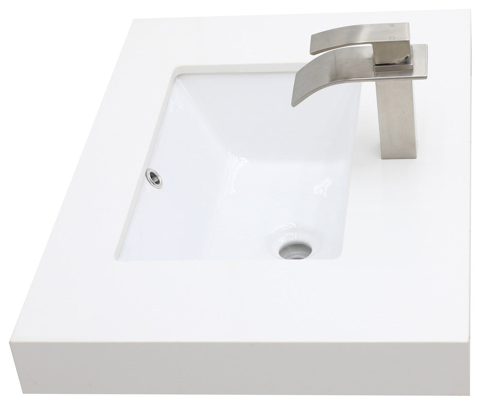 Vanity cabinet:•  Brand: WindBay •  Cabinet width : 47"•  Cabinet depth: 20"•  Cabinet height without countertop: 31-3/4"•  3 Heavy duty soft-closing drawer gliders. •  Durable finish and easy to maintain.•  Upgraded brackets. Construction hurricane grade brackets.•  Heavy Duty hydraulic soft-closing hinges.•  Cabinet fully assembled. Customer must install the legs and handles.•  Completely finished panels, including edges.•  Stainless steel adjustable legs.White quartz under mount countertop with built-up edges: All our counter tops are made from real quartz stone. Polished in a high durable stain and scratch resistant finish. One faucet hole is prefabricated. •  Width: 47-1/4" •  Depth: 20-1/4" •  Height: 3-1/8" •  Faucet hole: 1-3/8"(35mm) diameterWhite ceramic undermount sink with overflow: •  Width: 18" •  Depth: 11" •  Height: 5-1/2" •  Drain hole: 1-3/4"(45mm) diameter •  Round overflow with chrome trimIncludes: Sink, countertop, vanity cabinet, handles, and legs. Faucet and drain not included.Attention:Due to screen differences, the actual color may vary slightly from what appears on your monitor or phone. Contact us for a color sample if you need help selecting a finish.