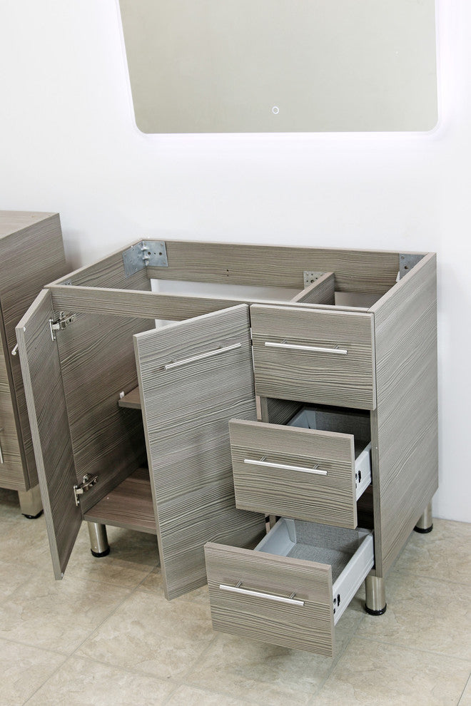 Vanity cabinet:•  Brand: WindBay •  Cabinet width : 47"•  Cabinet depth: 20"•  Cabinet height without countertop: 31-3/4"•  3 Heavy duty soft-closing drawer gliders. •  Durable finish and easy to maintain.•  Upgraded brackets. Construction hurricane grade brackets.•  Heavy Duty hydraulic soft-closing hinges.•  Cabinet fully assembled. Customer must install the legs and handles.•  Completely finished panels, including edges.•  Stainless steel adjustable legs.White stone counter top:The countertop is made from white stone. Polished in a high durable stain and scratch resistant finish. One faucet hole and one drain hole are prefabricated. •  Width: 48" •  Depth: 20-1/2" •  Faucet hole: 1-3/8"(35mm) diameter •  Drain hole: 1-3/4"(45mm) diameterWhite ceramic vessel sink: •  Width: 16" •  Depth: 16" •  Height: 5"Includes: Sink, countertop, vanity cabinet, handles, and legs. Faucet and drain not included.Attention:Due to screen differences, the actual color may vary slightly from what appears on your monitor or phone. Contact us for a color sample if you need help selecting a finish.