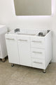 Vanity cabinet:•  Brand: WindBay •  Cabinet width : 47"•  Cabinet depth: 20"•  Cabinet height without countertop: 31-3/4"•  3 Heavy duty soft-closing drawer gliders. •  Durable finish and easy to maintain.•  Upgraded brackets. Construction hurricane grade brackets.•  Heavy Duty hydraulic soft-closing hinges.•  Cabinet fully assembled. Customer must install the legs and handles.•  Completely finished panels, including edges.•  Stainless steel adjustable legs.Black stone countertop: The countertop is made from black stone. Polished in a high durable stain and scratch resistant finish. One faucet hole and one drain hole are prefabricated. •  Width: 48"•  Depth: 20-1/2"•  Faucet hole: 1-3/8"(35mm) diameter•  Drain hole: 1-3/4"(45mm) diameterWhite ceramic vessel sink: •  Width: 16" •  Depth: 16" •  Height: 5"Includes: Sink, countertop, vanity cabinet, handles, and legs. Faucet and drain not included.Attention:Due to screen differences, the actual color may vary slightly from what appears on your monitor or phone. Contact us for a color sample if you need help selecting a finish.