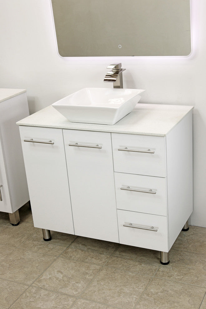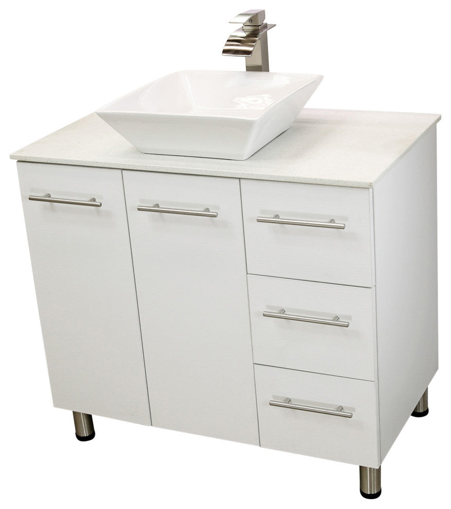 Vanity cabinet:•  Brand: WindBay •  Cabinet width : 47"•  Cabinet depth: 20"•  Cabinet height without countertop: 31-3/4"•  3 Heavy duty soft-closing drawer gliders. •  Durable finish and easy to maintain.•  Upgraded brackets. Construction hurricane grade brackets.•  Heavy Duty hydraulic soft-closing hinges.•  Cabinet fully assembled. Customer must install the legs and handles.•  Completely finished panels, including edges.•  Stainless steel adjustable legs.White stone counter top:The countertop is made from white stone. Polished in a high durable stain and scratch resistant finish. One faucet hole and one drain hole are prefabricated. •  Width: 48" •  Depth: 20-1/2" •  Faucet hole: 1-3/8"(35mm) diameter •  Drain hole: 1-3/4"(45mm) diameterWhite ceramic vessel sink: •  Width: 16" •  Depth: 16" •  Height: 5"Includes: Sink, countertop, vanity cabinet, handles, and legs. Faucet and drain not included.Attention:Due to screen differences, the actual color may vary slightly from what appears on your monitor or phone. Contact us for a color sample if you need help selecting a finish.