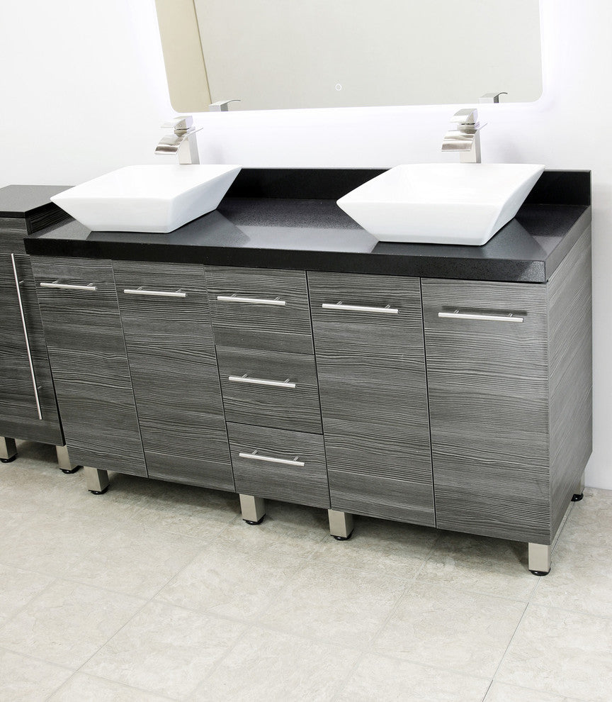 Vanity cabinet:•  Brand: WindBay •  Cabinet width : 59"•  Cabinet depth: 20"•  Cabinet height without countertop: 31-3/4"•  3 Heavy duty soft-closing drawer gliders. •  Durable finish and easy to maintain.•  Upgraded brackets. Construction hurricane grade brackets.•  Heavy Duty hydraulic soft-closing hinges.•  Cabinet fully assembled. Customer must install the legs and handles.•  Completely finished panels, including edges.•  Stainless steel adjustable legs.Black stone countertop: The countertop is made from black stone. Polished in a high durable stain and scratch resistant finish. Two faucet holes and two drain holes are prefabricated. •  Width: 60"•  Depth: 20-1/2"•  Faucet hole: 1-3/8"(35mm) diameter•  Drain hole: 1-3/4"(45mm) diameterWhite ceramic vessel sink: •  Width: 16" •  Depth: 16" •  Height: 5"Includes: Sink, countertop, vanity cabinet, handles, and legs. The faucet is not included.Attention:Due to screen differences, the actual color may vary slightly from what appears on your monitor or phone. Contact us for a color sample if you need help selecting a finish.