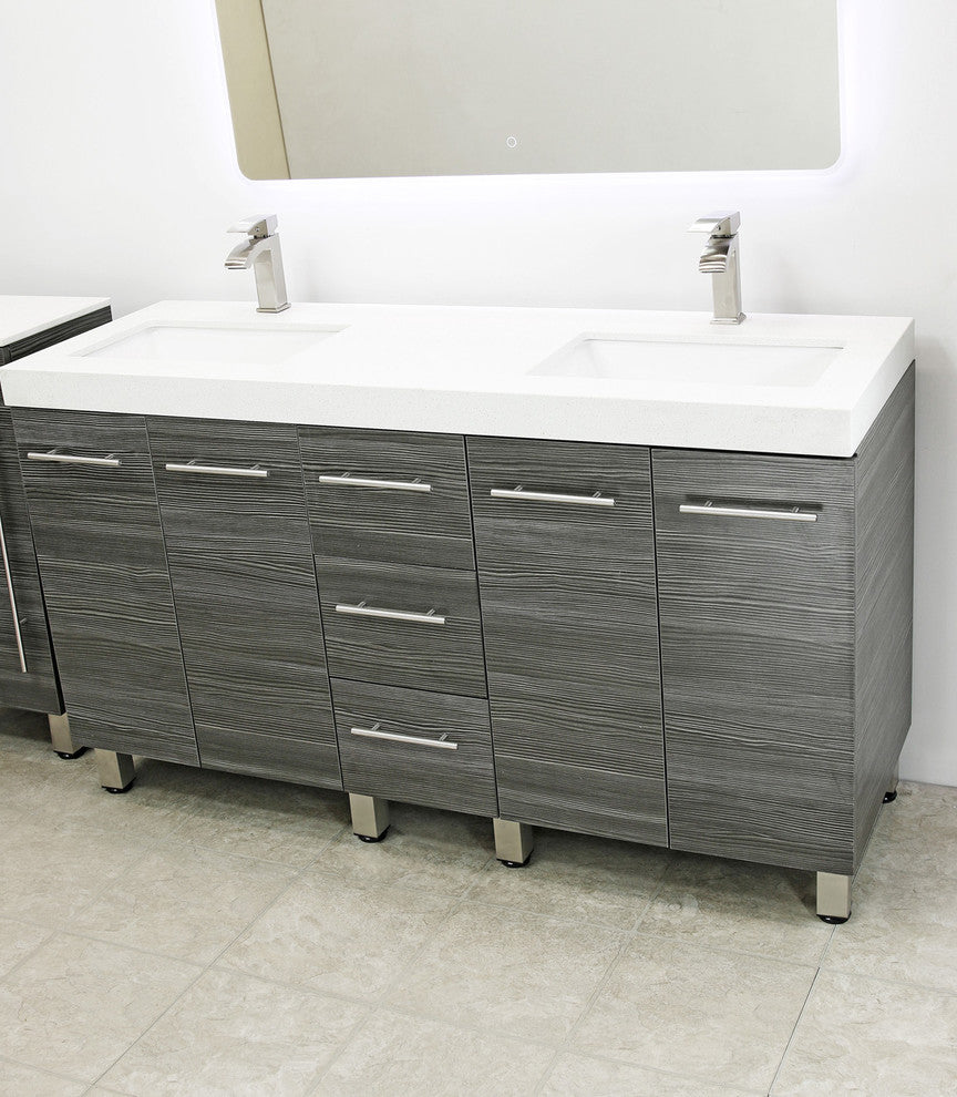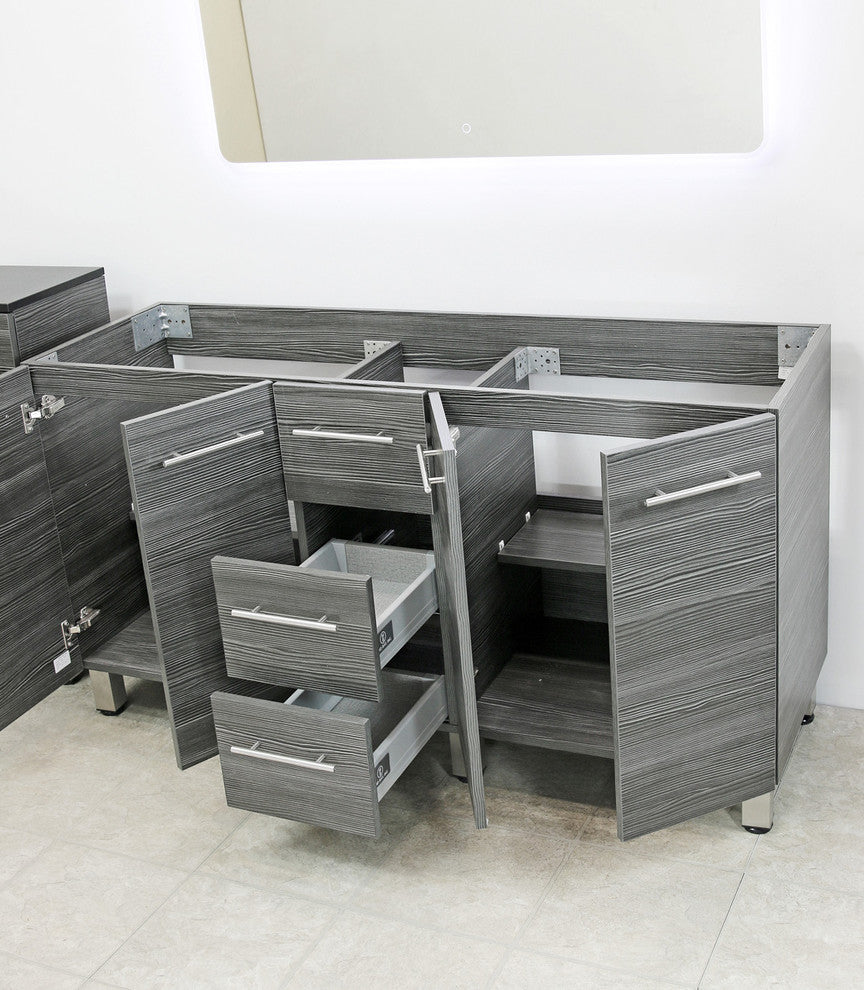 Vanity cabinet:•  Brand: WindBay •  Cabinet width : 59"•  Cabinet depth: 20"•  Cabinet height without countertop: 31-3/4"•  3 Heavy duty soft-closing drawer gliders. •  Durable finish and easy to maintain.•  Upgraded brackets. Construction hurricane grade brackets.•  Heavy Duty hydraulic soft-closing hinges.•  Cabinet fully assembled. Customer must install the legs and handles.•  Completely finished panels, including edges.•  Stainless steel adjustable legs.White quartz under mount countertop with built-up edges: All our counter tops are made from real quartz stone. Polished in a high durable stain and scratch resistant finish. Two faucet holes are prefabricated. •  Width: 59-1/4" •  Depth: 20-1/4" •  Height: 3-1/8" •  Faucet hole: 1-3/8"(35mm) diameterWhite ceramic undermount sink with overflow: •  Width: 18" •  Depth: 11" •  Height: 5-1/2" •  Drain hole: 1-3/4"(45mm) diameter •  Round overflow with chrome trimIncludes: Sink, countertop, vanity cabinet, handles, and legs. The faucet is not included.Attention:Due to screen differences, the actual color may vary slightly from what appears on your monitor or phone. Contact us for a color sample if you need help selecting a finish.