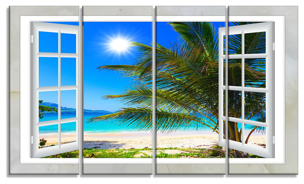 "Window Open To Beach With Palm" Seashore Wall Art, 4 Panels, 48"x28"