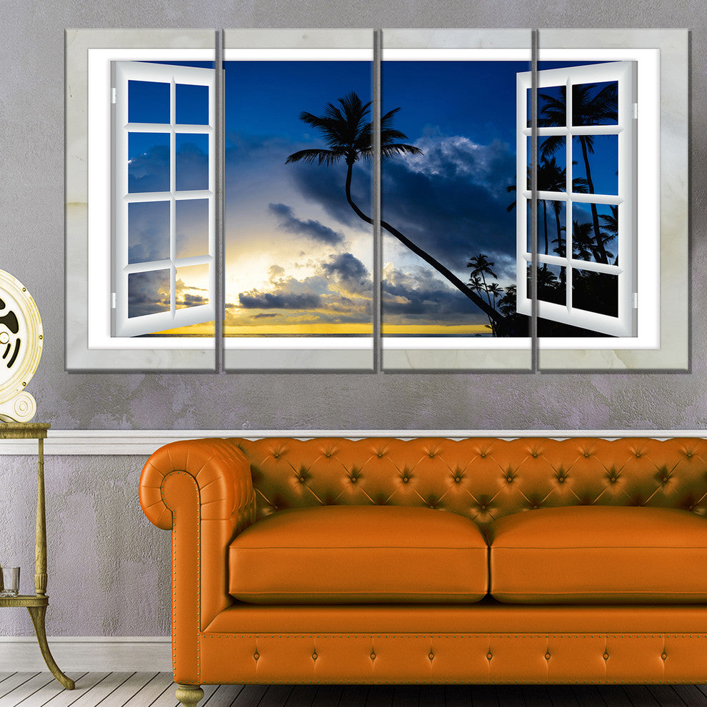 "Window To Beach With Coconut Palms" Landscape Art Wall Art, 4 Panels, 48"x28"