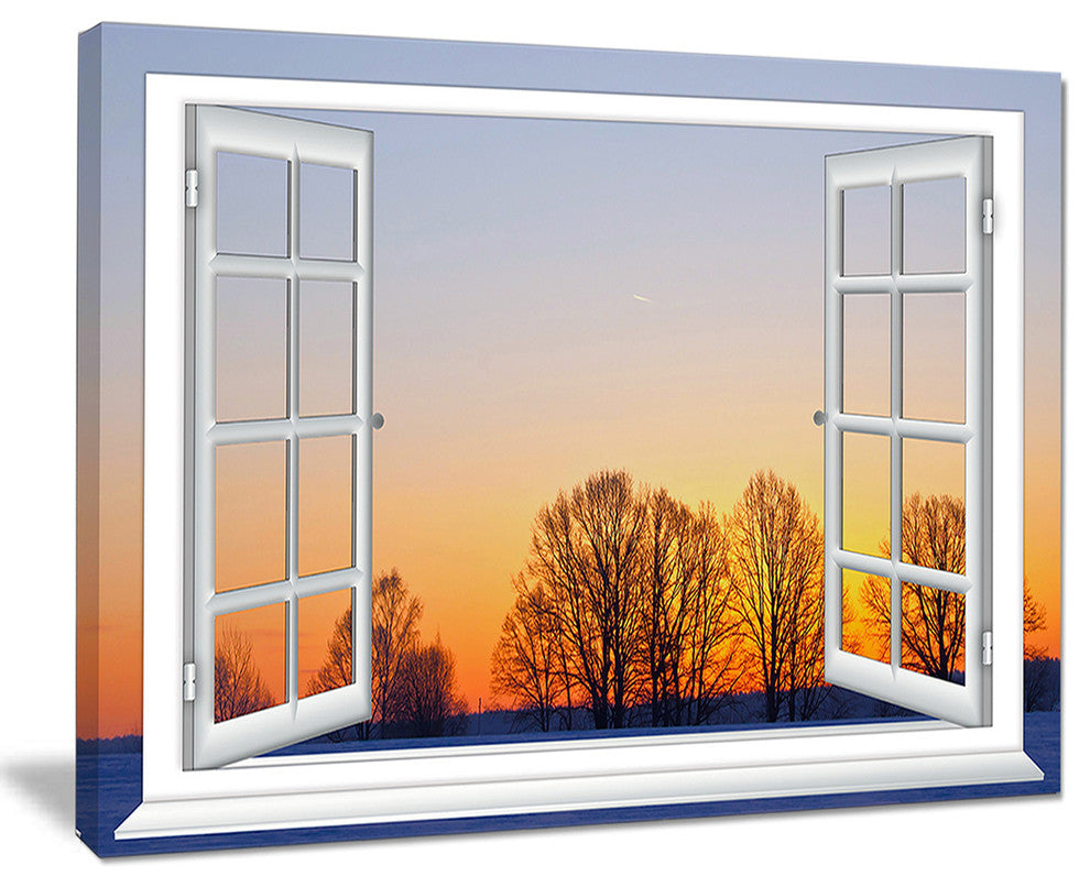 The Window to Sunset over the Snow canvas art print is sure to make an impression on anyone who sees it. This artwork is gallery wrapped around a 1-inch solid wood frame and arrives carefully packaged and entirely ready to hang on the wall. Design Art only uses the highest resolution and pigments to ensure a crisp colorful print that is never faded or pixelated. This artwork is sure to be a conversation starter in any home or office.