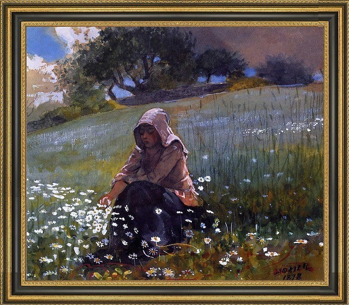 20" x 25" Winslow Homer Girl and Daisies framed premium canvas print reproduced to meet museum quality standards. Our Museum quality canvas prints are produced using high-precision print technology for a more accurate reproduction printed on high quality canvas with fade-resistant, archival inks. Our progressive business model allows us to offer works of art to you at the best wholesale pricing, significantly less than art gallery prices, affordable to all. This artwork is hand stretched onto wooden stretcher bars, then mounted into our 3 3/4" wide gold finish frame with black panel by one of our expert framers. Our framed canvas print comes with hardware, ready to hang on your wall. We present a comprehensive collection of exceptional canvas art reproductions by Winslow Homer.