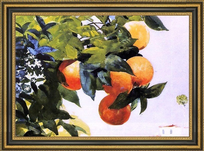 16" x 24" Winslow Homer Oranges on a Branch framed premium canvas print reproduced to meet museum quality standards. Our Museum quality canvas prints are produced using high-precision print technology for a more accurate reproduction printed on high quality canvas with fade-resistant, archival inks. Our progressive business model allows us to offer works of art to you at the best wholesale pricing, significantly less than art gallery prices, affordable to all. This artwork is hand stretched onto wooden stretcher bars, then mounted into our 3 3/4" wide gold finish frame with black panel by one of our expert framers. Our framed canvas print comes with hardware, ready to hang on your wall. We present a comprehensive collection of exceptional canvas art reproductions by Winslow Homer.