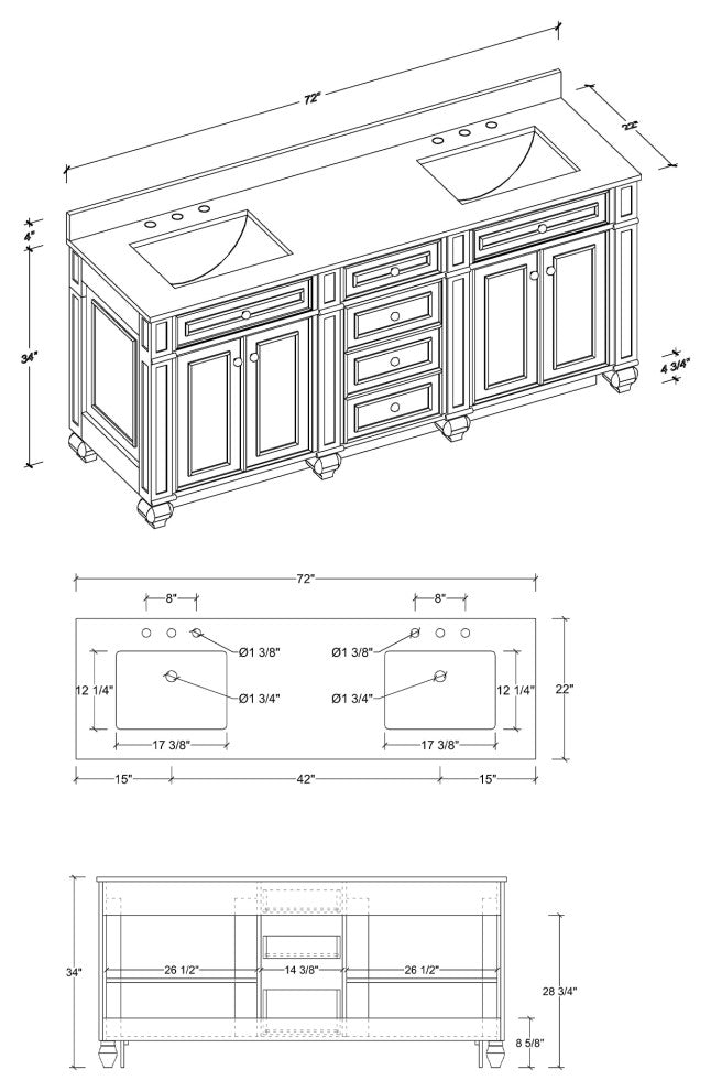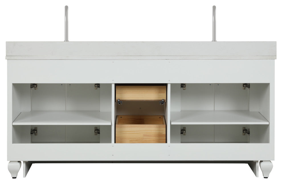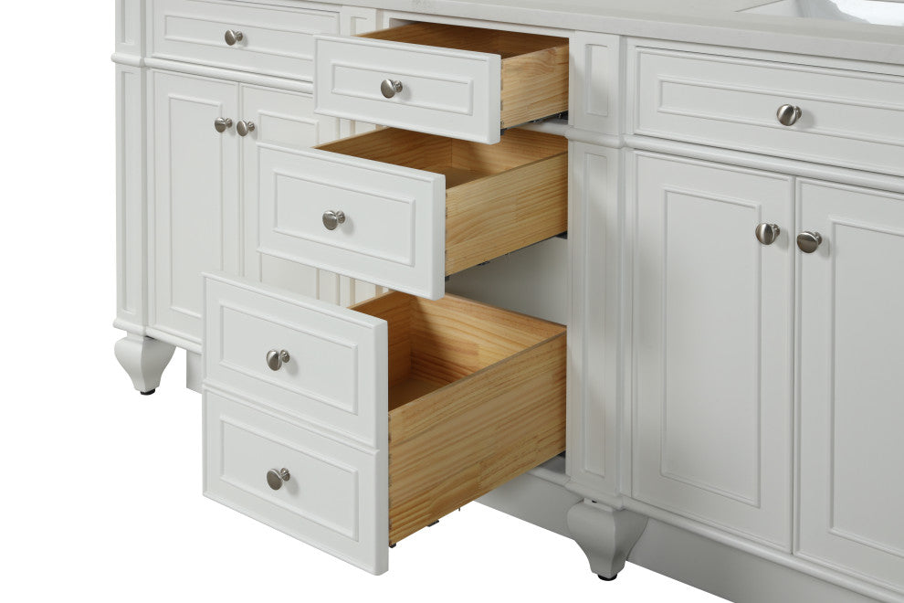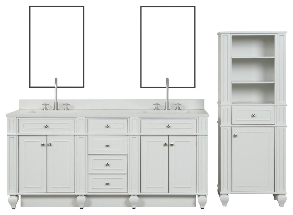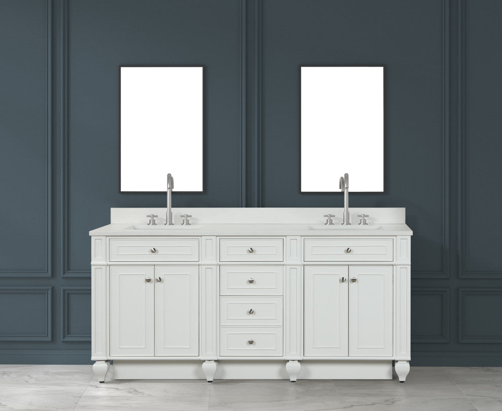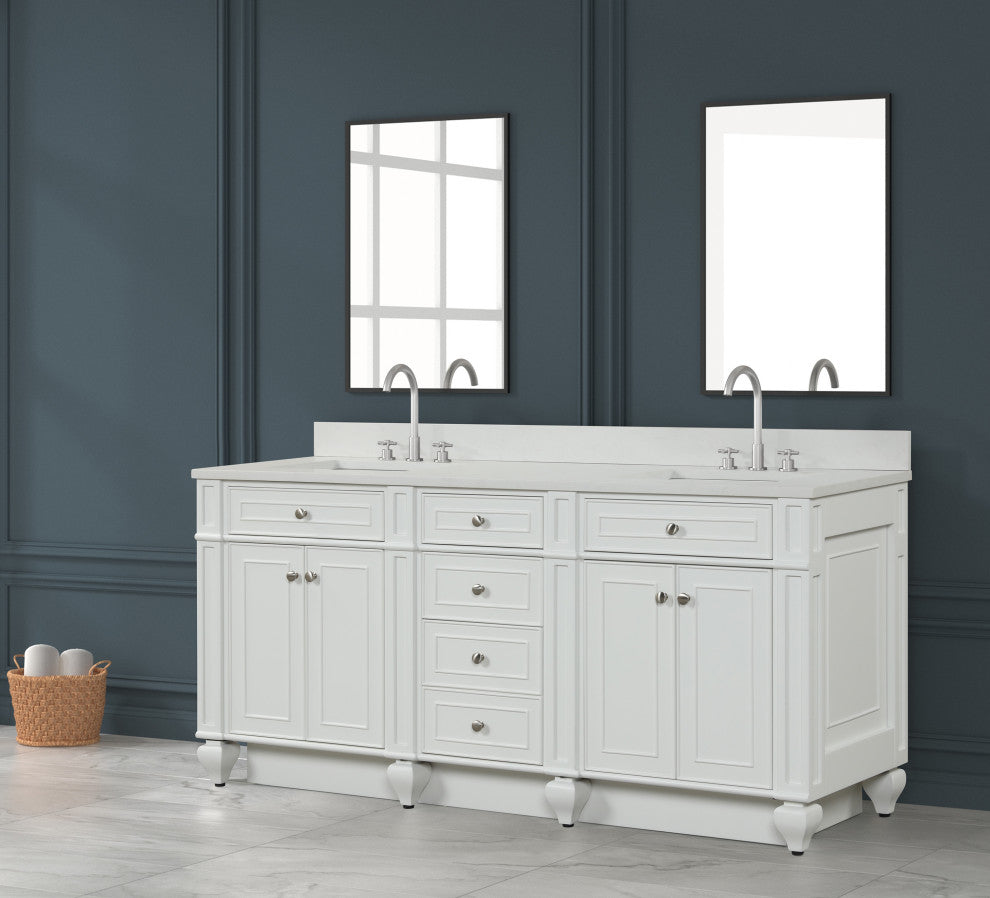 Combining traditional charms with modern features, this elegant Winston vanity by Design Element will instantly transform your bathroom into a work of art. All Winston vanity cabinets are constructed from solid birch hardwood and paired with a 1 inch thick antique white quartz countertop and backsplash that is both beautiful and low maintenance. Soft closing doors and drawers provide smooth and quiet operations, while brushed finished metal hardware provides the perfect finishing touch. Other fine details include white porcelain sinks with overflow, dovetail joint drawer construction, toe kick, predrilled holes to accommodate 8-inch widespread faucets, and multi-layer paint finish on the cabinets provide beauty and durability for years to come. Mirrors, faucets and drains are not included.Multi-layer paint finished vanity cabinets constructed from solid birch hardwood1" thick white quartz countertop with pre-drilled holes to accommodate 8" wide spread faucets3 functional soft closing drawers with dovetail joinerySoft close doors with concealed adjustable hingesMetal hardware in brushed nickel finishPorcelain undermount sink with overflow includedMatching backsplash is includedMirror, faucet and drain not included