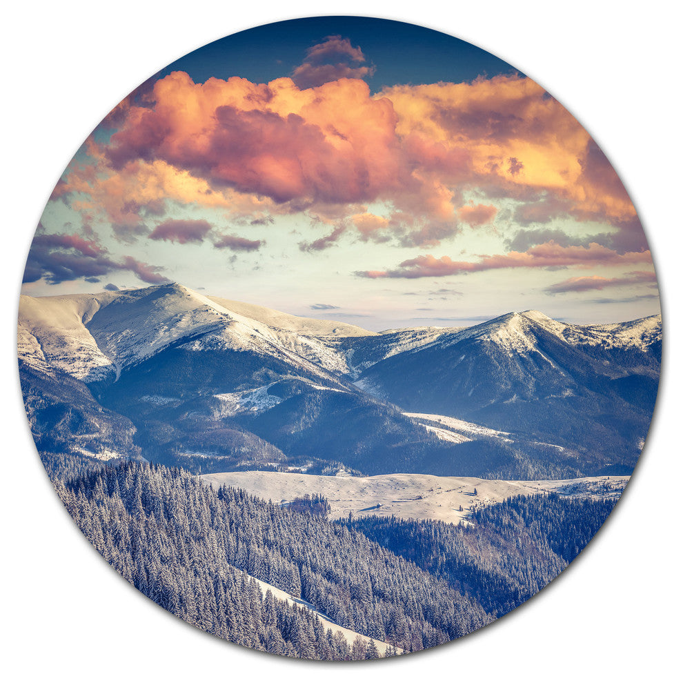 Winter Alpine Sunset Over Hills, Landscape Art Round Metal Artwork, 23"