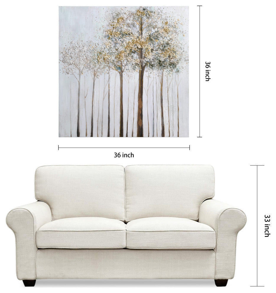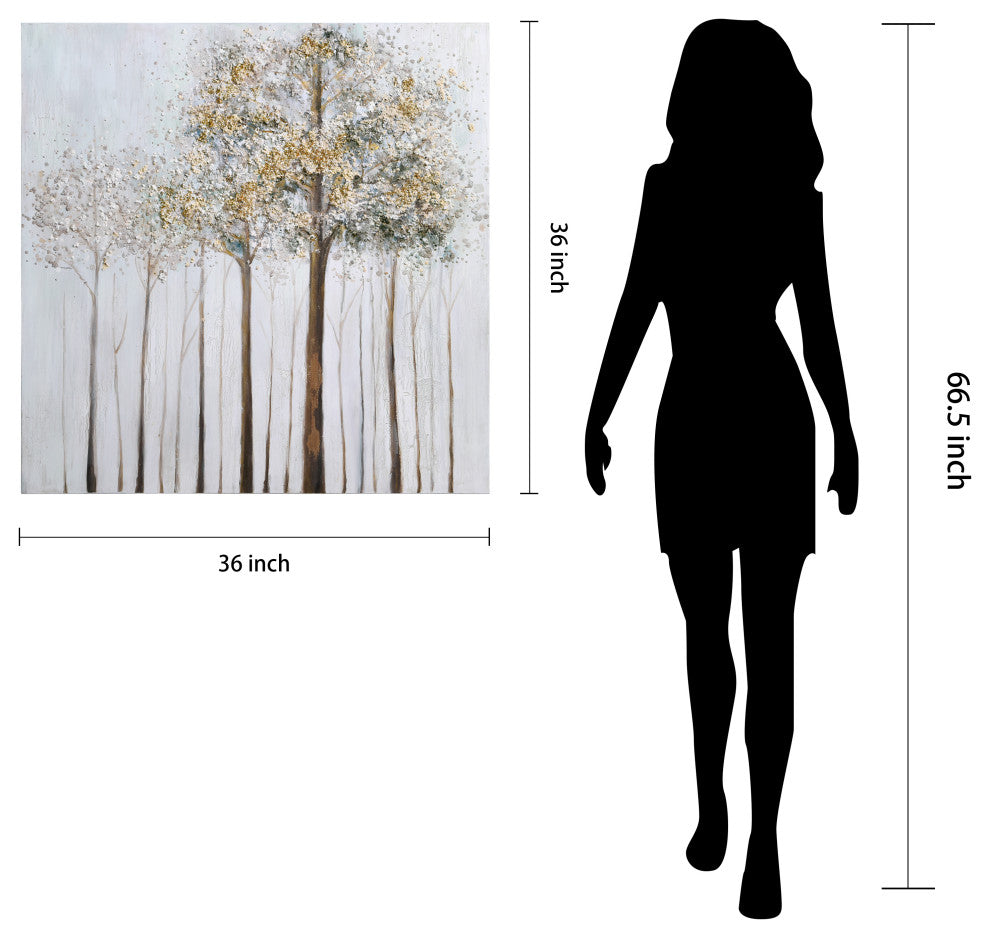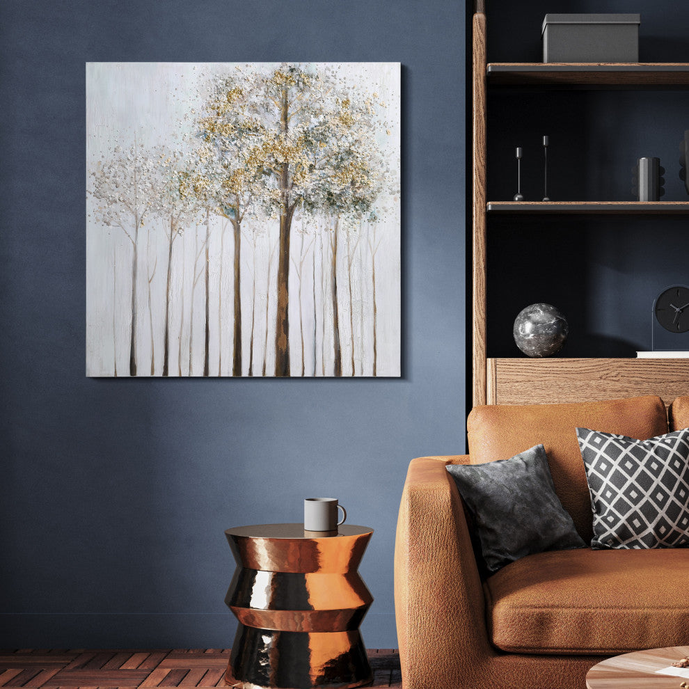 Artist Martin Edwards loves the texture and feel of paint and the sensuous beauty of color and tries to make the most of these two elements in his original works of art. This specific style shouts movement and mood as it moves across the canvas and the color only serves to intensify the emotion displayed. This piece uses subtle variations in technique and metallic color combinations to display a three-dimensional, hand painted, piece of art that displays a white and gold abstract of trees in nature that has been embellished with silver glitter. Comes pre-installed with D-rings and rope which makes it simple to display on wall, depending on your reference. Each panel includes mounting nails and hooks for ease of installation.