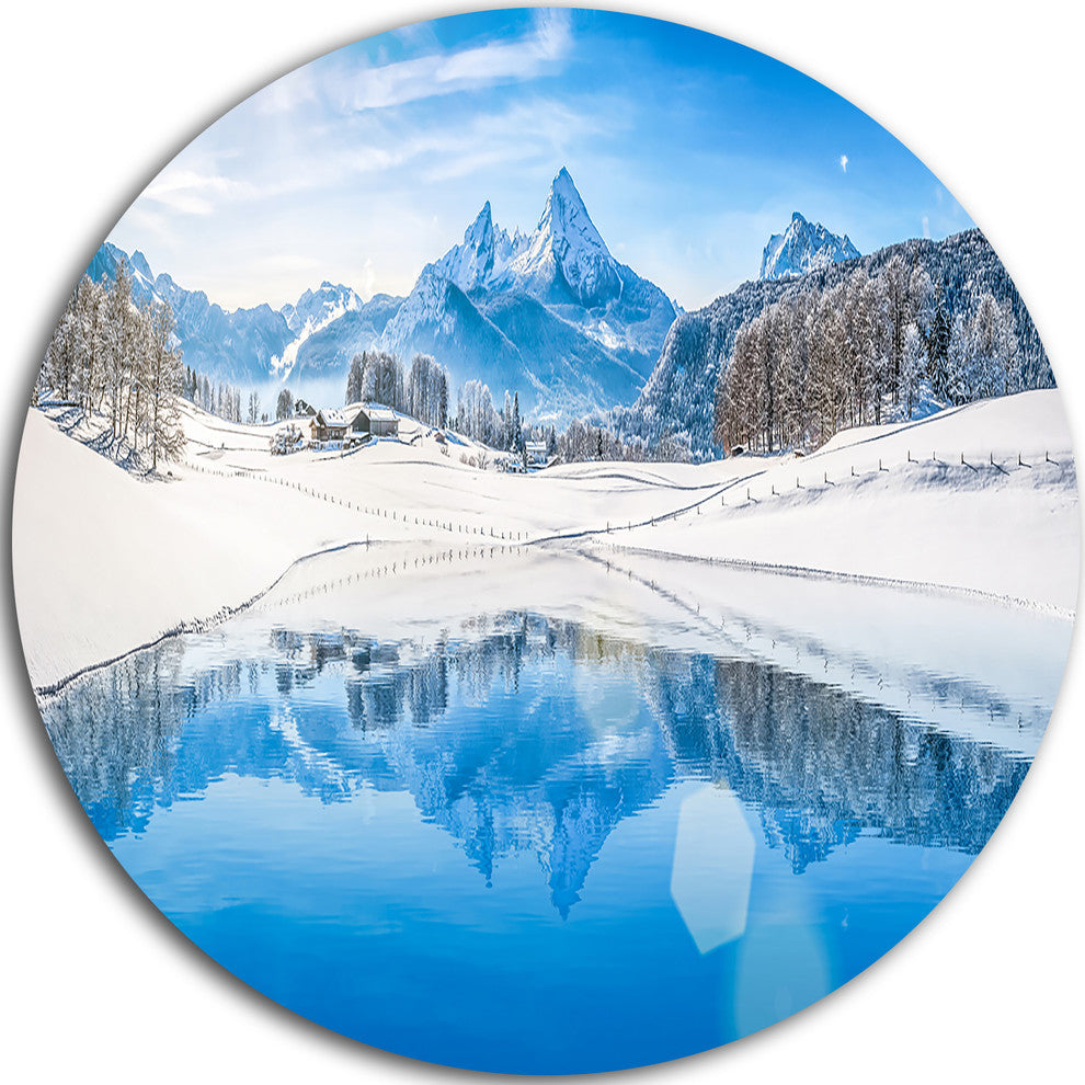 Bring Contemporary Abstraction to your home with this large Circle Metal wall art. This Winter Mountain Lake in Alps Metal Artwork makes it the focal point of any room or office.
