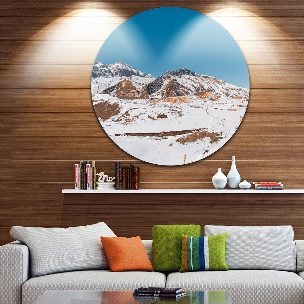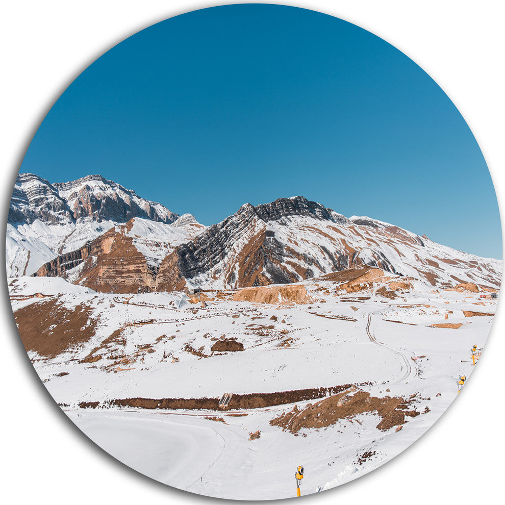 Bring Contemporary Abstraction to your home with this large Circle Metal wall art. This Winter Mountains in Azerbaijan Metal Artwork makes it the focal point of any room or office.