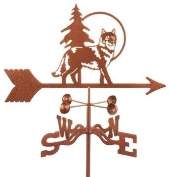 The wolf with it''s intense gaze is an American symbol of freedoom and is on the hunt for a new home. Perhaps in your lawn or gardenLaser cut, 14 g steelZinc chromate plated for better adhesion, durability and rust prevention.Has a baked on Polyester Copper Vein powder coat for a hammered antique copper look.Has a baked on Clear Polyester powder coat to protect against UV rays and fading.Includes post mount (for vertical surfaces), 14" rod, directional and windcups.Sealed ball bearings in the windcup to insure that the windcup turns in the slightest breeze.All design tops are interchangable.Assembles and installs in minutes.Quality handcrafted in the USA.NOTE: Please refer to second image to view the type of base mount this weathervane comes with.