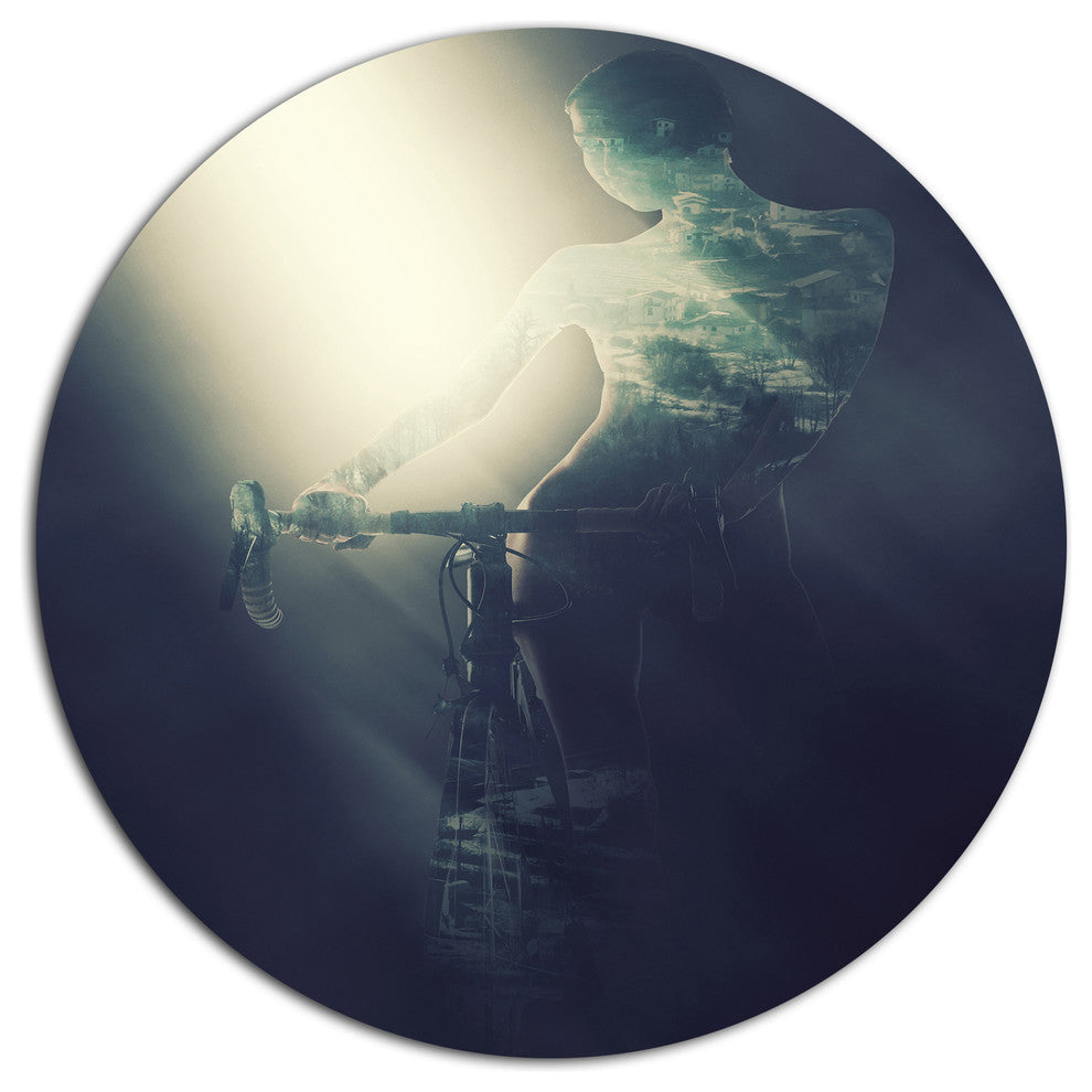 Bring Contemporary Abstraction to your home with this large Circle Metal wall art. This Woman with Bicycle in Spotlight Metal Artwork makes it the focal point of any room or office.