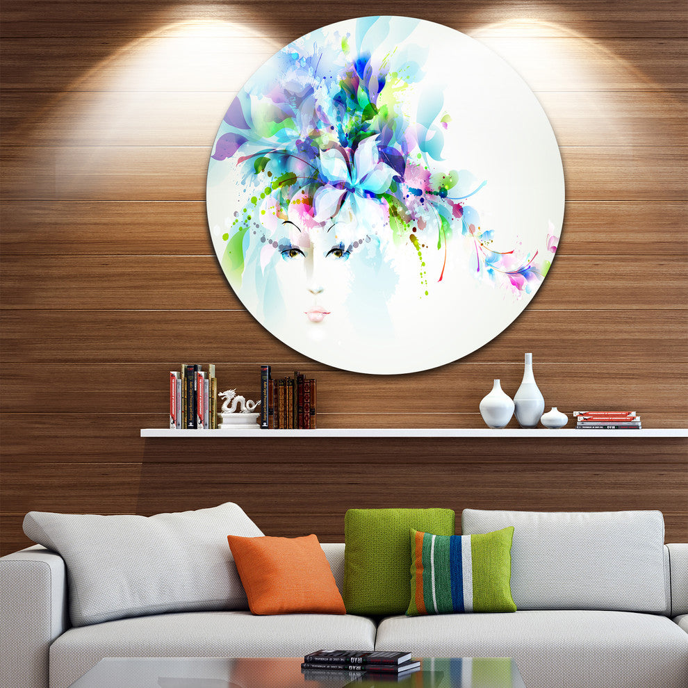 Bring Contemporary Abstraction to your home with this large Circle Metal wall art. This Woman with Blue Flowers Metal Artwork makes it the focal point of any room or office.