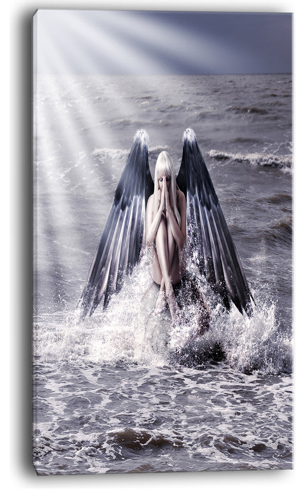 "Woman With Dark Angel Wings" Modern Beach Canvas Art Print, 16"x32"