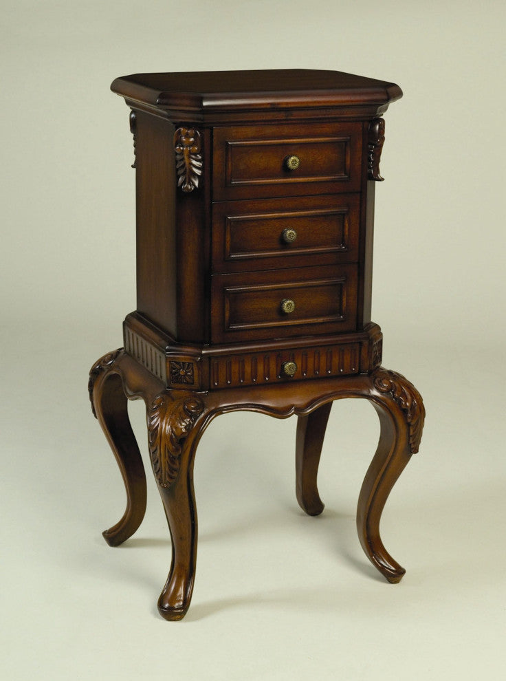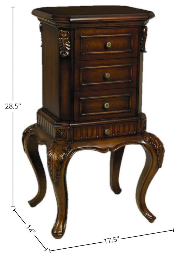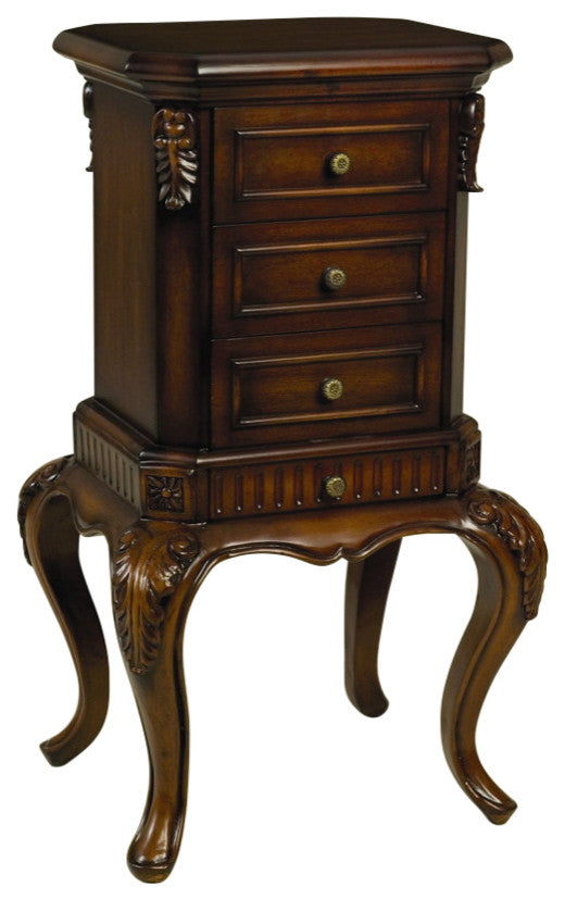 Add an antique accent to your spaces with the End Table. Bearing traditional design, it features a dark wood color that remains a classic in furniture design. It has four drawers for easy storage. Wood engravings detail this piece and it stands on classic cabriole legs. Place this beside your sofas or beds and it will complete the overall look of your space.Features:Overall product dimensions are 17.5" W x 14" D x 28.5" HBoasts a classic dark brown finishThe table stands on four cabriole legsFour drawers for easy storageLow-maintenance and easy to cleanDimensions:End TableAssembled Product: 17.5 inches wide x 14 inches deep x 28.5 inches high.