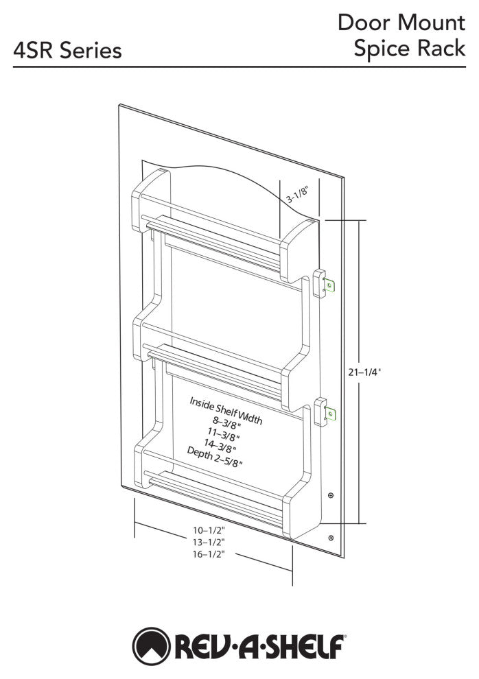 Rev-A-Shelf helps to maintain shelf space and keep spices within reach. The Rev-A-Shelf 4SR wood door mount spice rack series is best in class. Easy to install and all hardware Included:.-Included: (1) Wood spice rack with Chrome rails and mounting hardware-Product is designed to hold standard spice bottles (2.25")-Designed for a standard 30" tall wall cabinet.-Requires a minimum opening of 17-3/4"-7" height between the shelves-(3) Fixed Shelves-Door mount brackets: Adjustable door mount brackets are Included: and required for operation-Construction: Fully Assembled Maple Wood construction with a clear coat finish for durability-Mounts to cabinet door with only (4) screws