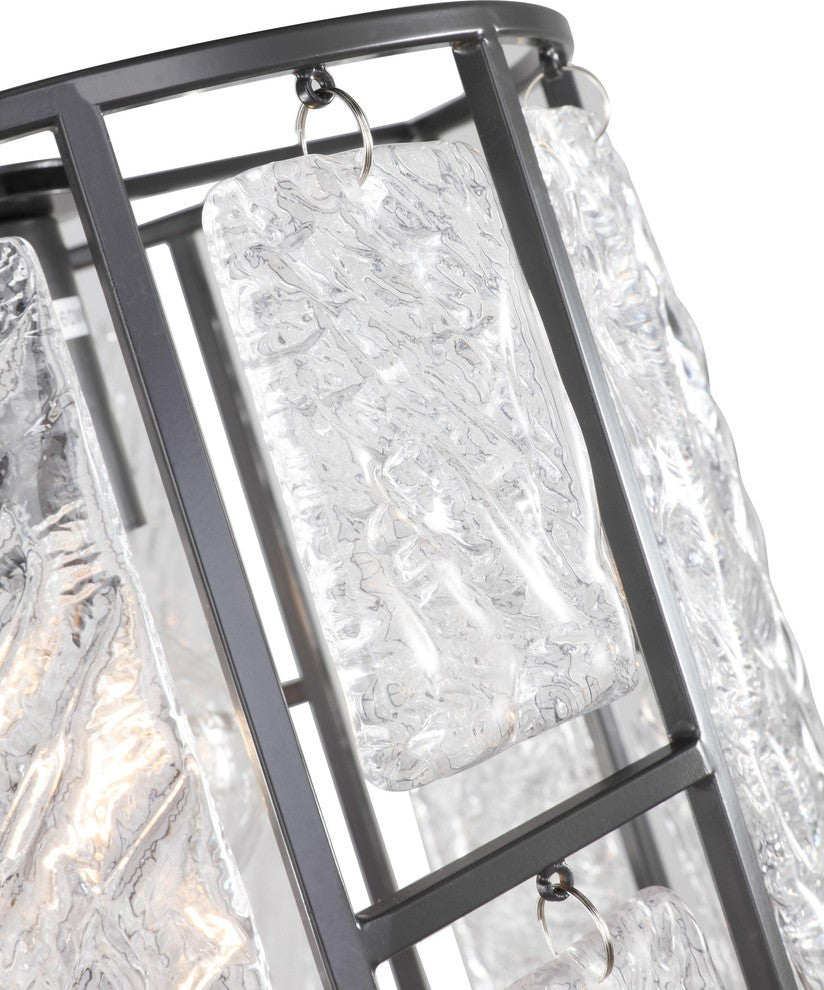 This mini-Pendant displays an impressive array of sculpted piastra glass tiles that resemble natural ice formations. It will display a constant flow of movement to the room as they shimmer freely around the sturdy dark bronze frame, whether the lights are on or off.