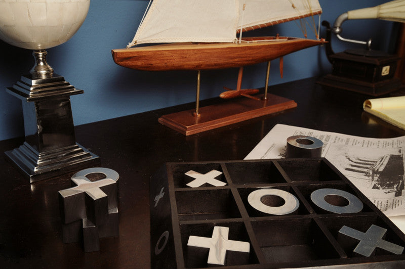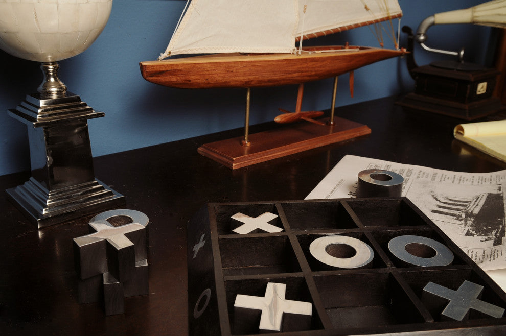 • Base made out of dark wood with a felt lining on the bottomX-O pieces made out of aluminum with a shiny nickel finish
