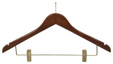 These sturdy, well-constructed hardwood hangers feature a space-saving flat body, two carefully crafted notches for the option of hanging straps, and a polished brass anti-theft nail hook. This style also features two polished brass clips with clear anti-stain cushions. Finished with a double coating of lacquer to prevent splintering, these high quality, low cost hangers will last you for a lifetime. Must be used with A-Ring (600111) or B-Ring (600222).