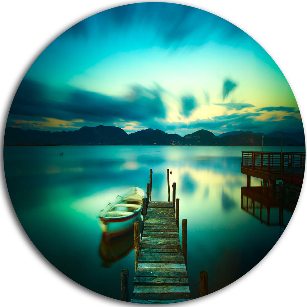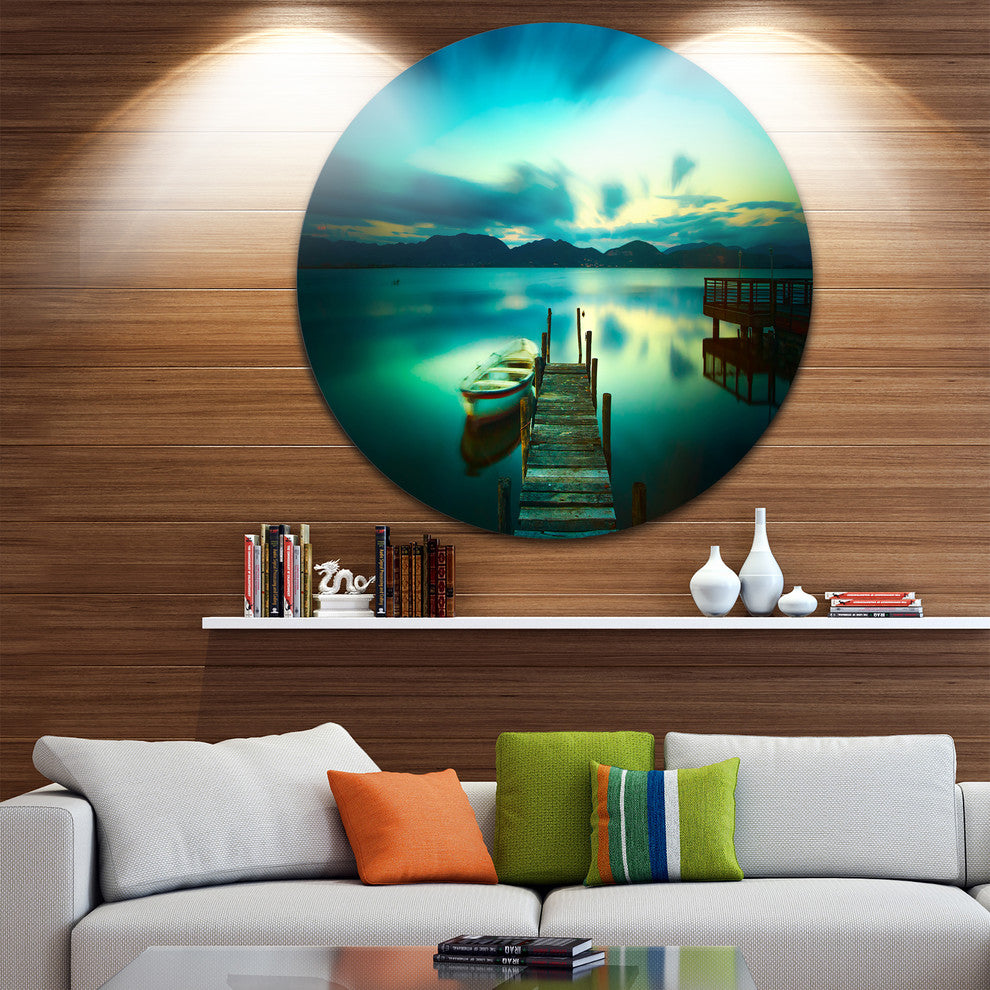 Bring Contemporary Abstraction to your home with this large Circle Metal wall art. This Wooden Jetty and Boat in Sea Metal Artwork makes it the focal point of any room or office.