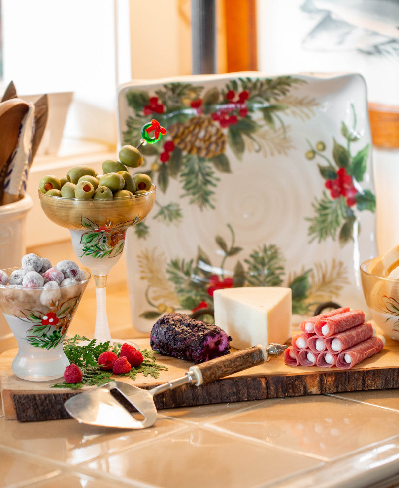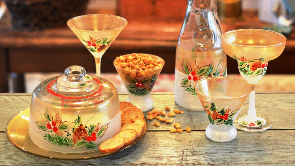 Each of our margarita glasses are unique and special. Carefully and lovingly hand painted by the Artistic Team at Golden Hill Studio. Our Woodland Pine Collection features pretty pine cones and red berries on a pine bough. A great way to celebrate the holidays and all winter through! Golden Hill Studio is not just about fine glassware but about fine living!