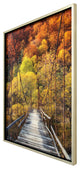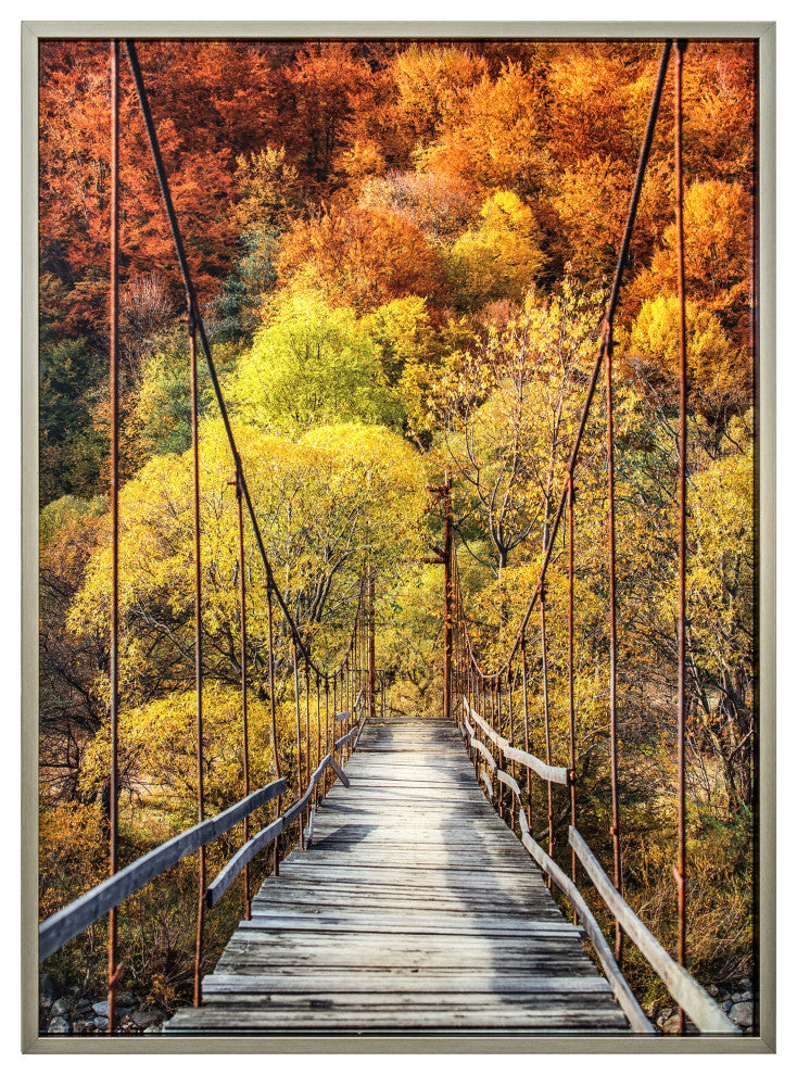 A suspended bridge is created through the hues of yellows and oranges with pops of green. Evoking a desire to explore the wilderness, this piece is printed on glass with a silver frame, making it a focal point for any space.