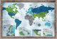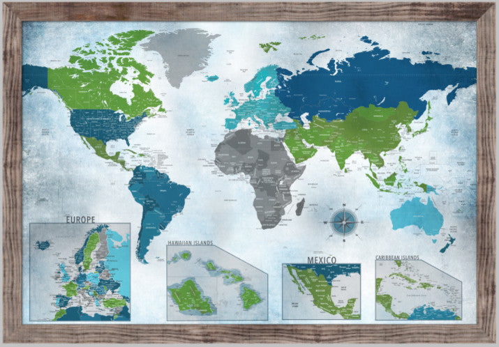 World Map Push Pin Map, Water Color Blues With Insets, 24"x36", Barnwood Frame