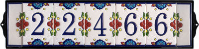 A wrought iron frame that holds six Mission tile numbers or five number tiles and two endings. This is a simple handmade artistic frame, but carefully designed to enhance your house tile numbers. It was designed to be hung horizontally. Internal dimensions (where the actual tiles sit) are: 25" wide by 6 1/4" tall. House Numbers Frames Installation Suggestions:Horizontal installation: Use two screws, one on each side of the frame, preferably black head (not included). If your wall is a hard surface such as stucco or brick, mark the holes and pre-drill them attaching two anchors and then attaching the two screws to them